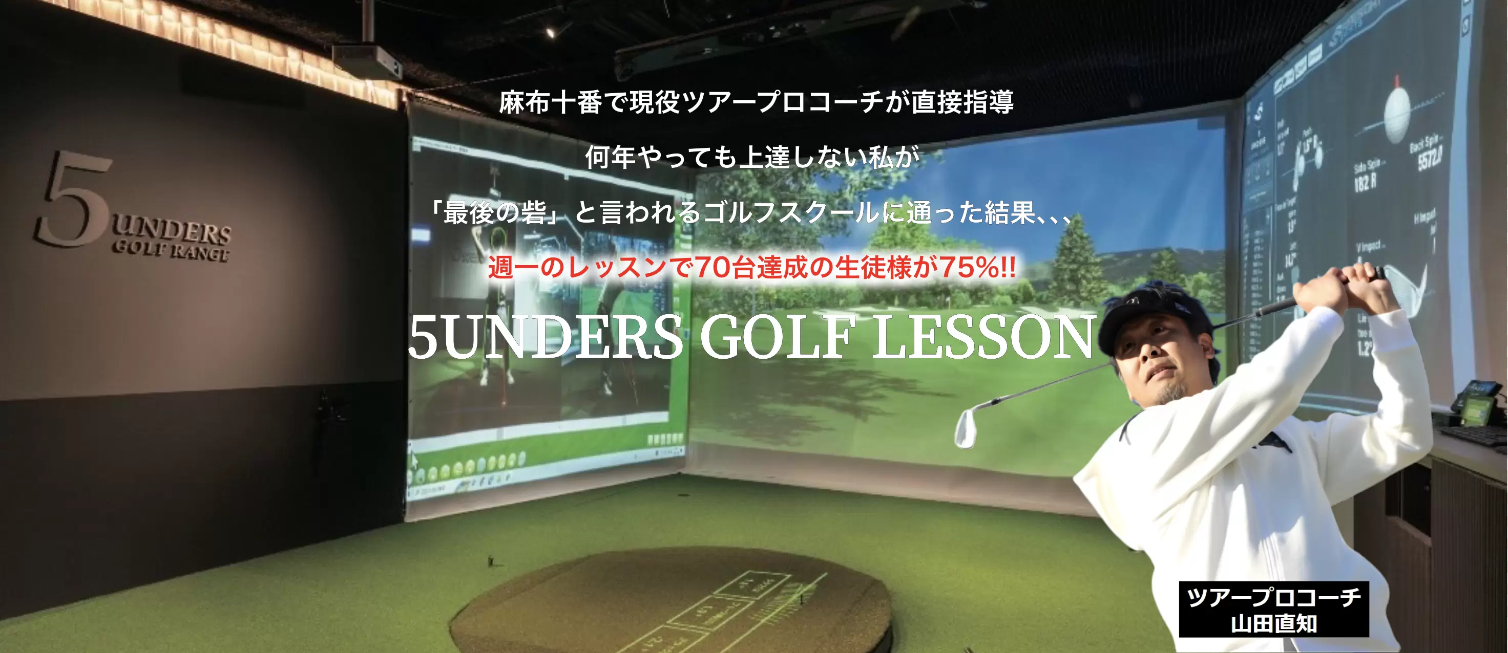 5UNDERS GOLF RANGE代表の山田直知です。多くの生徒様から要望があった「スイングを綺麗にしたい!」という思いに応えるためには、ゴルフの知識だけでは限界を感じたので、関節や筋肉などの解剖学を学び、整体師の資格を取得しました。そして、レッシュトレーナーやTPIトレーナーの資格も取得し、人それぞれ異なる体の動き、筋肉の最大最良な使い方、コンディションの保ち方、アンチエイジングなどもお伝えしたく、幅広く学びました。その結果、順天堂大学の小林弘幸教授とご縁があり、怪我をしにくいセルフエクササイズを一緒に広めたり、アメリカツアーでNo.1に輝いたローリー・マキロイ選手のコーチ、グレッグ・ローズ博士からも直接指導を受け、ゴルフに必要な身体についてもたくさん学んでおります。さらに、最高峰の弾道測定器「Flight Scope」とは、日本人初の契約を結び、ゴルフ界に新しい理論を提案しました。そして、複雑な「D-plain」理論を誰でも簡単に理解できる「4plane+2face」メソッドを完成させました。このメソッドを使えば、ミスショットや球の曲がりも自分で解決できるようになるので、プレイ中に起こる不調にも『自己診断・自己治療』が可能となり、ゴルフが一層楽しくなること間違いなしです!このメソッドは書籍化され、Amazonでゴルフレッスン書ランキング2位にもランクインしました。美スイングを追求し、韓国のトッププロ育成機関「GOLFZON ZOIMARU」や「JOONGBU UNIVERSITY」で美しいスイング作りを学び、私のレッスンにも取り入れています。プロゴルファーは優勝に導き、アマチュアの方はスコア70台を達成するなど、多くの方々をサポートしております。ゴルフがもっと楽しくなるよう、無駄のない練習方法であなたのゴルフライフを何倍にも何十倍にも充実させて見せます!